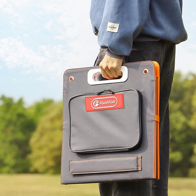 - [ Easy Setup And Kickstand Included ]: The Flashfish 100W solar panel features 4 kickstands that can be placed firmly on any surface ground. With just a few seconds of setup, you can start soaking energy from the sun for your power stations. The TPE rubber handle allows you to carry around easily when taking off-grid adventures.