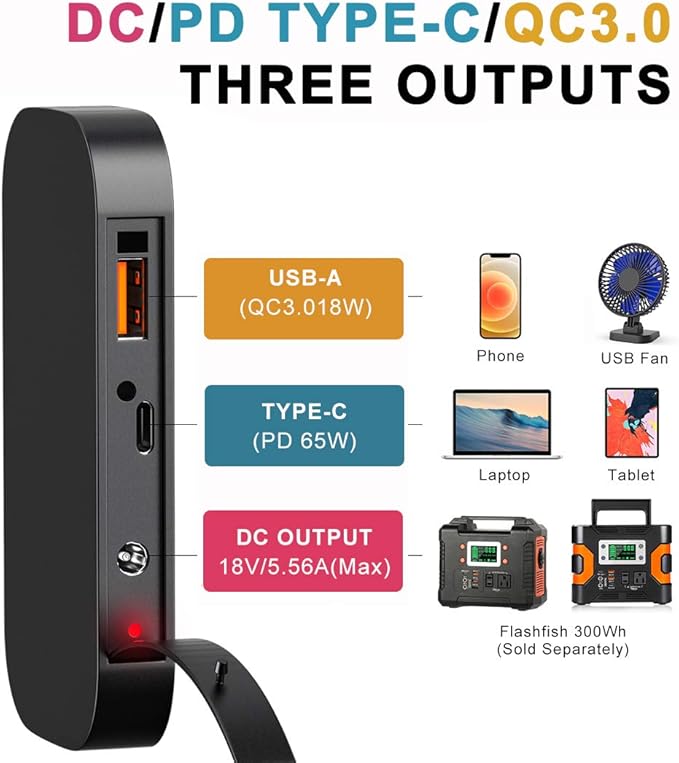- [ 3 Outputs ]: The solar panel features with 1*USB-C(65W), 1*USB-A(18W) port and 1*DC Output.Charging multiple devices at the same time, such as smartphones and tablets, GPS, digital cameras, etc. Ideally suited for outdoor life and even unexpected power outages.