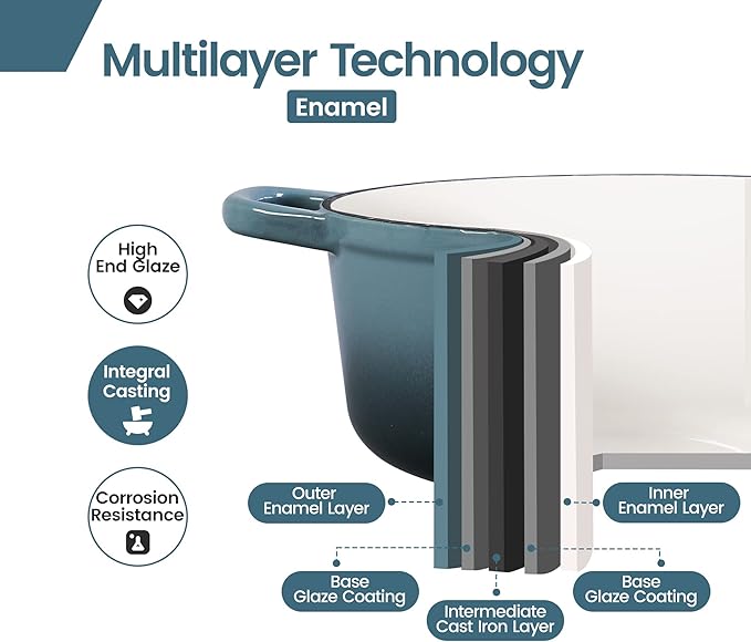- Suitable for 6-7 people: The 5.5 quart enamel Dutch oven is the choice for cooking food and desserts. Its design makes your food look more delicious