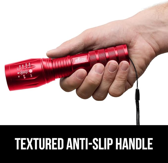 GORILLA GRIP Powerful LED Tactical Flashlight, 750 FT High Lumens 5 Adjustable Modes, Water Resistant, Ultra Bright Zoom Flashlights, Small Mini Flash Light, Camping, Night Dog Walking, 2 Pack Red