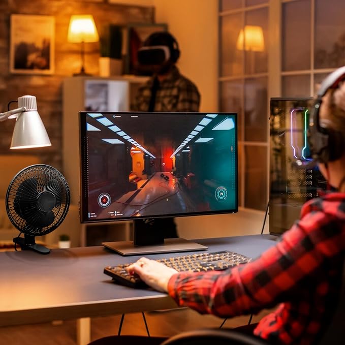 - ADJUSTABLE AIRFLOW: The 2-speed desk fan rotates 360 degrees, and the adjustable tilt function lets you easily direct airflow simply by positioning the head of the fan for targeted cooling performance.