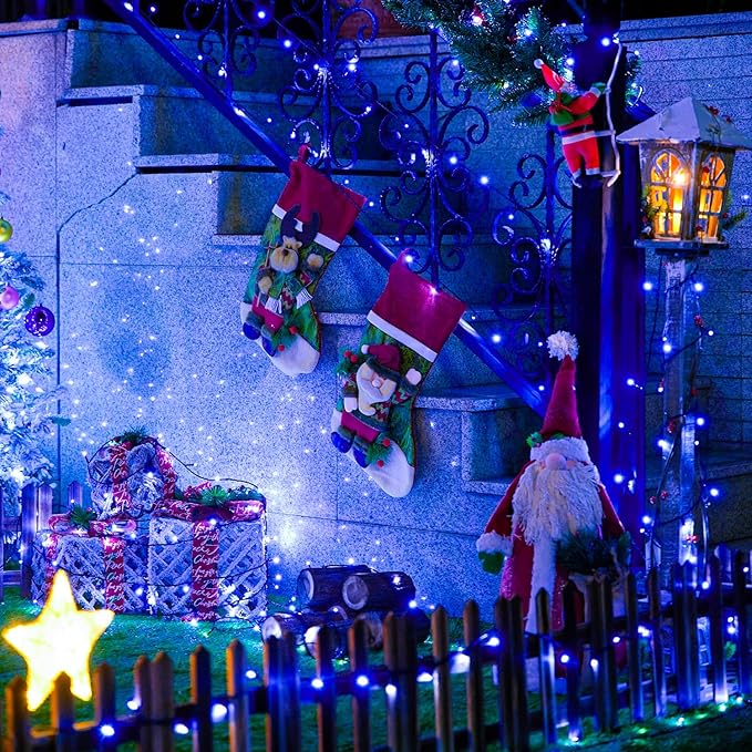 - END TO END CONNECTIVITY: Our upgraded version features a generous length of 91.5 ft, adorned with 200 plus 50 lamp beads, perfectly complementing a variety of decorations. With the ability to expand to a maximum of 4 light chains, from 250 LED to 1000 LED (maximum 366 ft), you can effortlessly connect multiple sets of blue Christmas lights, effortlessly transforming a larger area into a mesmerizing display. Say goodbye to the hassle of needing more plugs and sockets.
