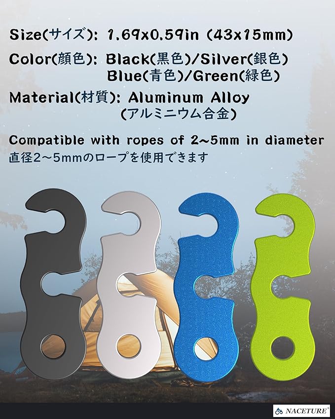 - โ HIGH-QUALITY AND DURABLE ROPE TENSIONER - Replaces the cheap plastic cord tensor you already have on your camping and outdoor equipment, and say hello to these amazing, compact, and durable guy lines tensioner tent cords made of quality aluminum alloy which is ultralight, and convenient to carry in your backpack on a camping.