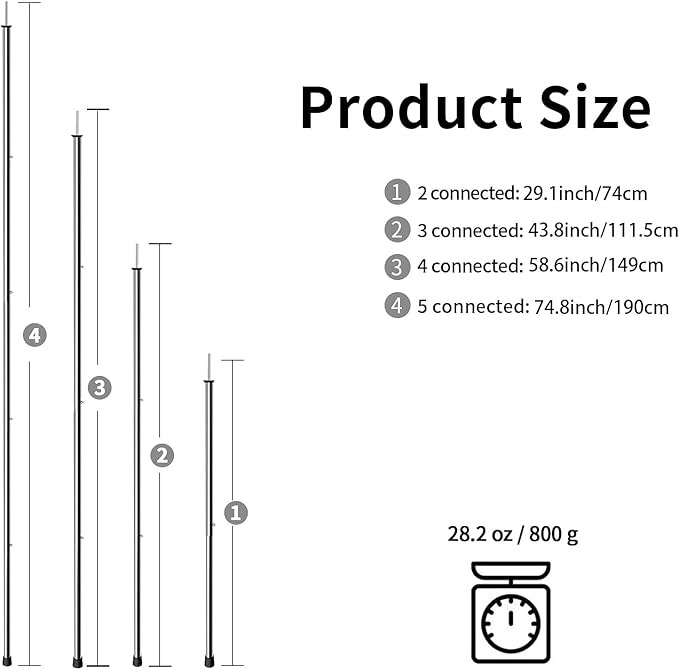- Adjustable Tent Poles -- Camping poles Set of 2 (10 sections),each section is about 16.9 in in length,0.75in diameter.Tent poles have four lengths to choose from: 31.9 in,47.2 in,62.2 in,78.1 in,only 16.5 in when stored,you can carry it easily.