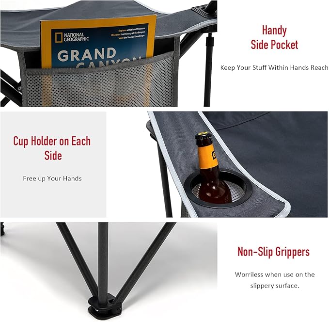 - Super Handy & Space Saving: The folding chairs camping has a built-in bottle opener and 2 cup holders free your hands while camping, picnic, hiking, traveling or fishing, and easily store your drinks, sunglasses, and phone within hands reach. The packed size is 40"x8.5"x8".