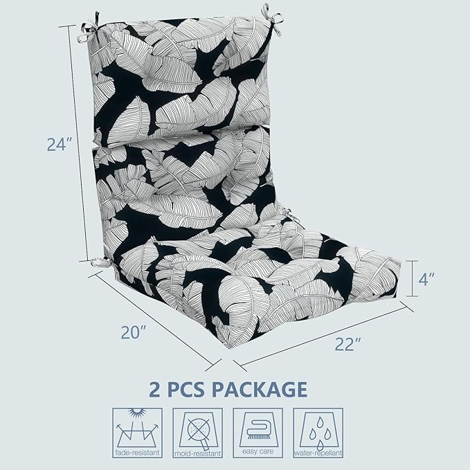 LVTXIII Outdoor Seat/Back Chair Cushion Patio Tufted High Back Cushion, Seasonal Replacement Rocking Chair Cushion with Ties (44” L x 22W”, Set of 2, Black Lush Leaf)