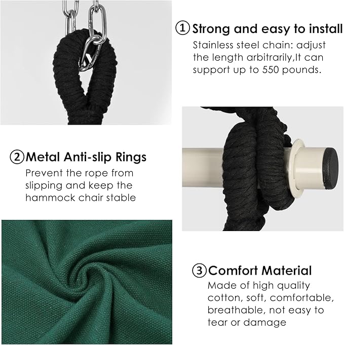 - hammock chair: Safe and strong , the sturdy spreader bar makes the hammock chair more stable. The anti-slip grooves on both sides can effectively prevent the rope from sliding, and the maximum weight is up to 500 Lbs
