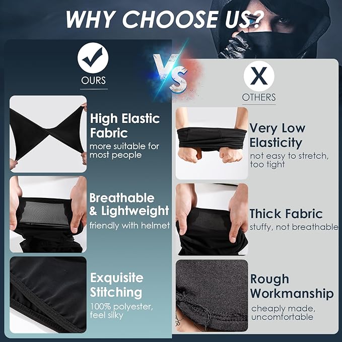 - 【Versatility】Can be worn as opened or closed balaclavas, face masks, neck gaiters, scarf or bandanas, helmet liners & ninja hoodie, or headbands even wristbands. People use Achiou full face mask for skiing, riding, fishing, snowboarding, motorcycling, hiking, climbing, running or cosplay. Just don't wear it in an airport or bank
