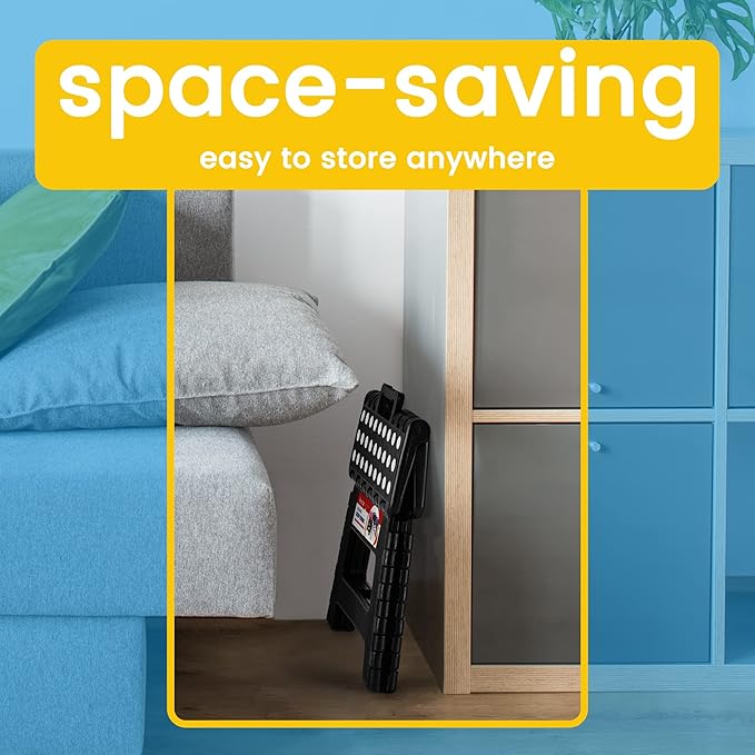 - CARRYING HANDLE - Ergonomic carrying handle is designed for easy folding and carrying. Just lift the handle, it will fold easily and quickly in a split second with only one hand. The step stool’s handle magically appears when the stool is folded flat. Allowing you comfortably carry it around so they can place it where they need it.