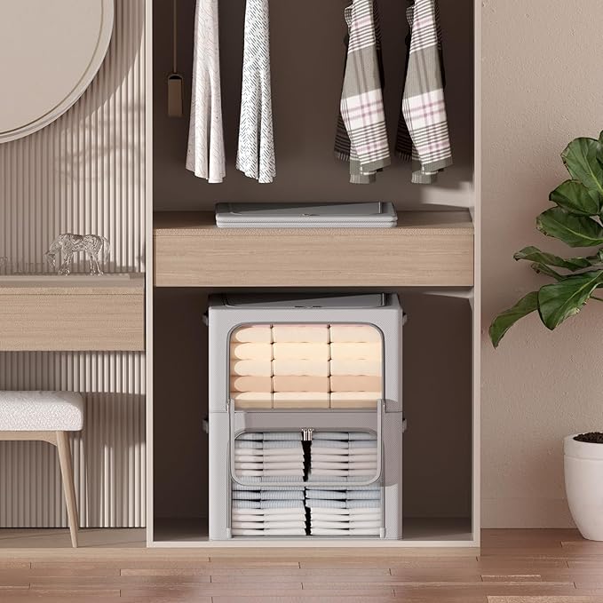3Pack Frame Storage Box - Clothes Storage Bin Bags Oxford Fabric Foldable Stackable Container Organizer Set with Clear Window & Carry Handles Large Capacity (Grey, Large-66L)