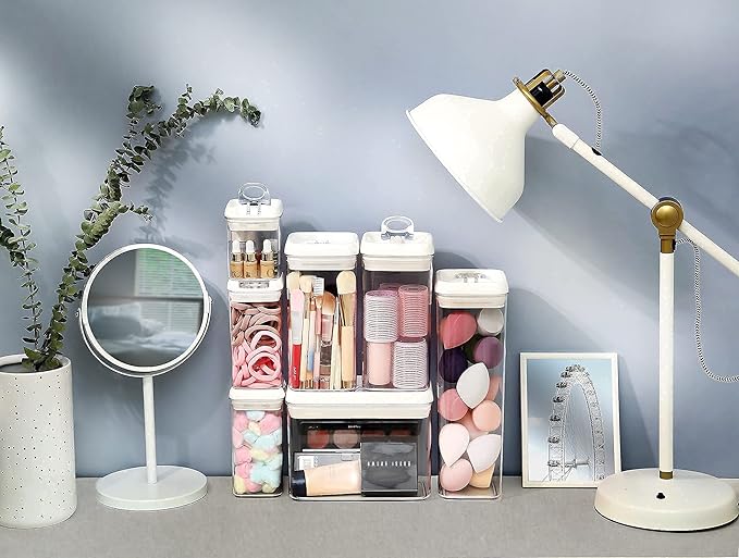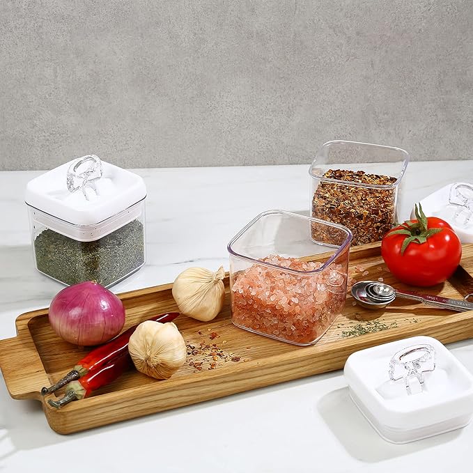 - STACKABLE & SPACE SAVING: Containers are designed to be stacked firmly on top of each other to save space in your pantry, fridge, desk, room, kitchen countertop, cupboard, and cabinet shelves. Our Regular sized containers can be stacked firmly with Rectangular sized containers to help you max out space efficiency.