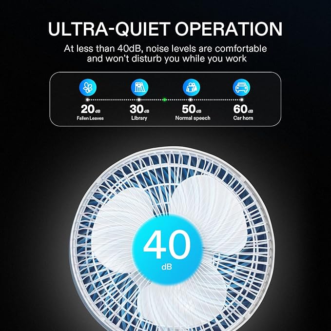 - Strong Airflow & Low Noise: At just 40 dB at its loudest, this fan runs ultra-quiet, and with an upgraded 20W copper motor still produces powerful airflow for coolness you can feel even from a distance