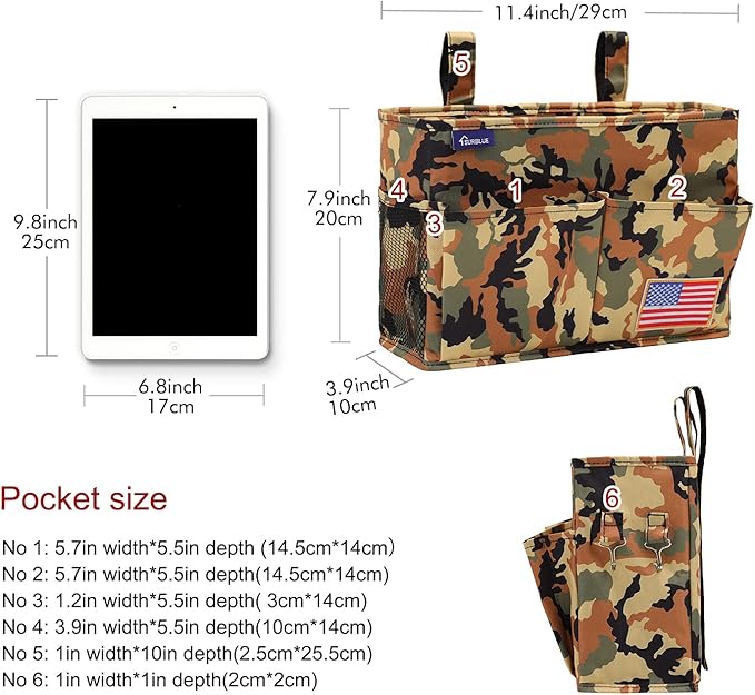 Surblue Bedside Caddy Hanging Organizer Storage Bag Pocket for Bunk, Hospital Beds, College Dorm Rooms, Baby Bed Rails, Wheelchair Side Bag, Camp Chairs, 4 Pockets and 2 Hooks (Small Desert)