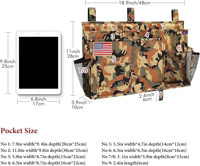 - Size: The large bedside caddy is 19*3.9*11 inches/48*10*28cm. The storage bag has 8 pockets that are bunk bed accessories, meeting the request for multi-storage.