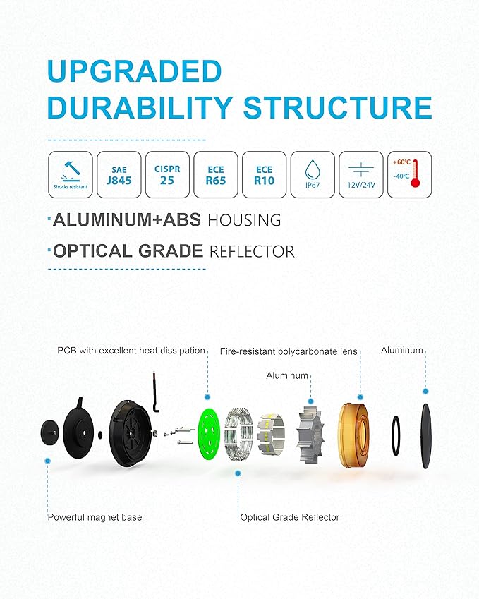 - 【MAGNETIC BASE】This magnetic flashing safety light for trucks is suitable for all vehicles;with a strong magnetic bottom, 6 magnetic pods with protective rubber feet;easy to install on any external metal