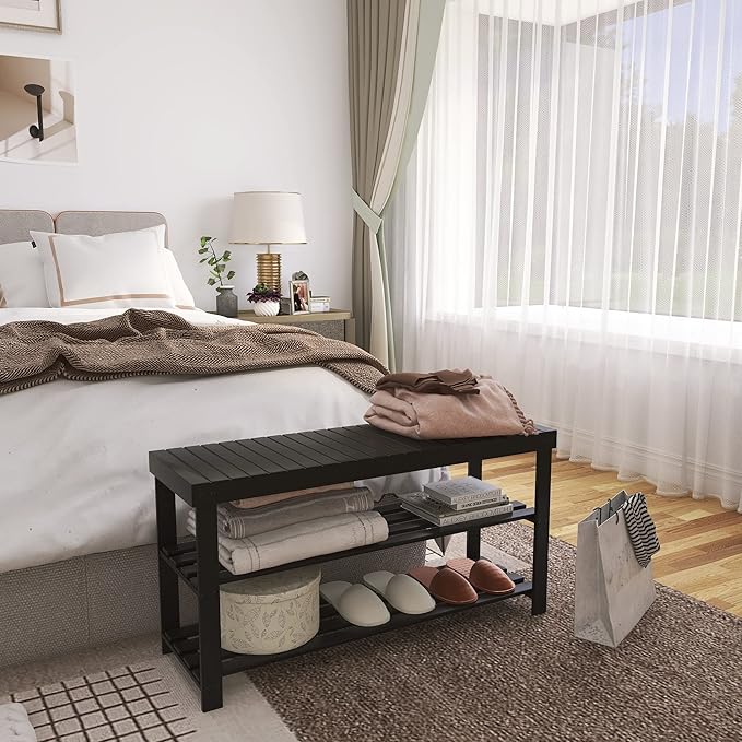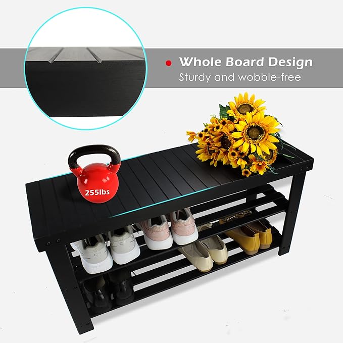 SMIBUY Bamboo Shoe Rack Bench, 3-Tier Shoe Organizer Storage Shelf for Entryway Hallway Bathroom Living Room (Black)