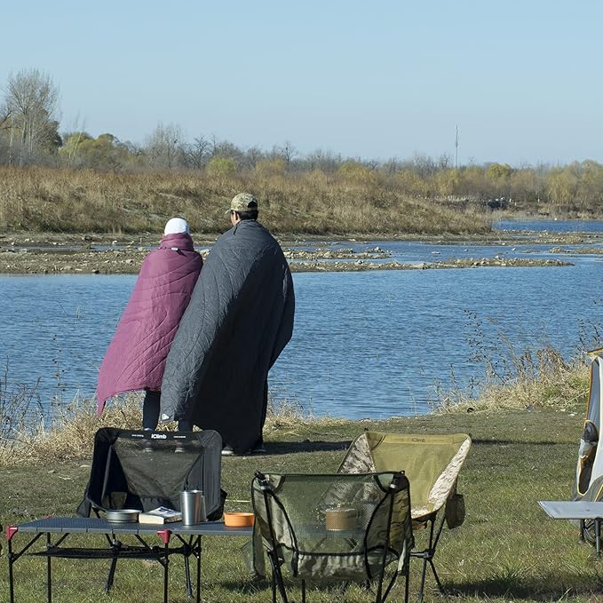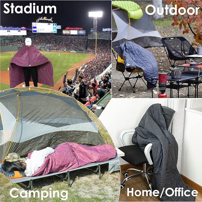 - Multifunctional. With the buttons and elastic straps, this blanket can be used as quilt, poncho, shawl, temporary sleeping bag. You can also put two blankets together and make it one two-person sleeping bag. Keeping you cozy while sitting around the fire or on your couch, lying in hammocks, reading books, tailgating, cooking meals. Perfect for camping, backpacking, hiking, mountaineering, traveling, lounging, picnics, beach trips, concert events, airplane trips, and other outdoor activities.