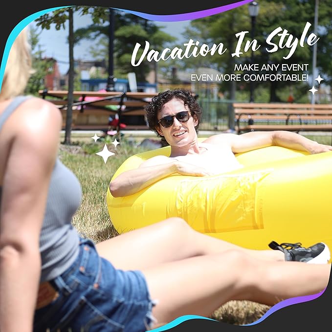 - INFLATABLE OUTDOOR FURNITURE FOR ON-THE-GO: With our inflatable chairs for adults & kids, pack light & relax anytime, anywhere! Use our inflatable couches for movie night , a backyard barbecue, lounging by the pool, a camping adventure, comfort at the beach or under the stars & so much more. From music festivals to firework shows & picnics, these inflatable movie chairs provide the versatility you need. Take convenience & style with you wherever you go with the Nevlers Yellow Blow Up Chairs !