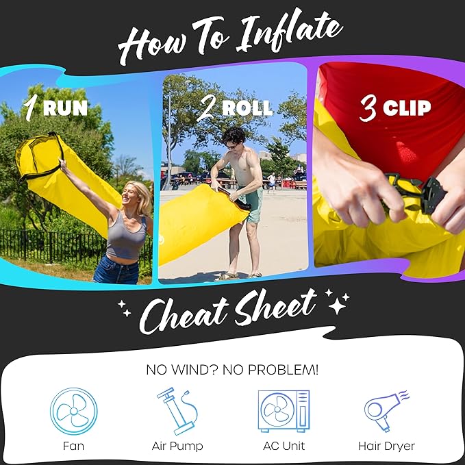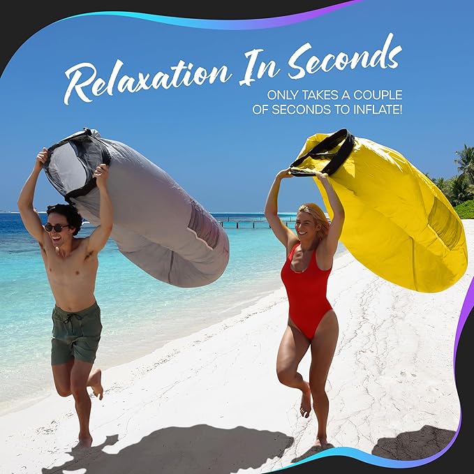 - WIND OPTIONAL SET UP: Setting up the Nevlers Air Sofa is as easy as 1-2-3! Simply run a few feet, roll it up, then clip it to have your inflatable furniture ready in no time. No wind? No worries! Even if there's no breeze, you can use a fan, hair dryer, or air pump to inflate the air chair . When it's time to pack up, deflate & fold the inflatable lounge chair into the drawstring bag for lightweight storage. No need to lug around bulky chairs with our conveniently portable couch .