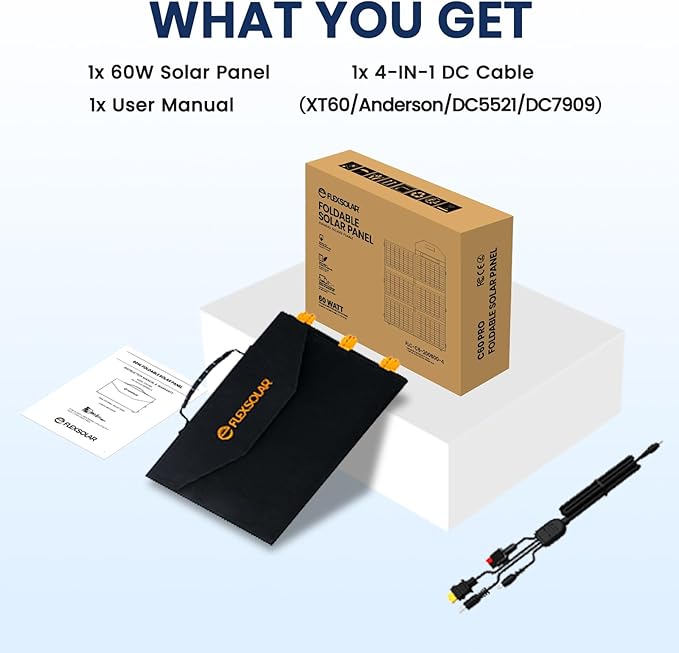 - 【What You Get】1 * FlexSolar 60W solar panel, 1 * 4-in-1 DC Charging connectors(XT60/DC5521/DC7909/Anderson output), 1* user manual.customer support, we have 24hrs customer service, any problem can be solved for you.