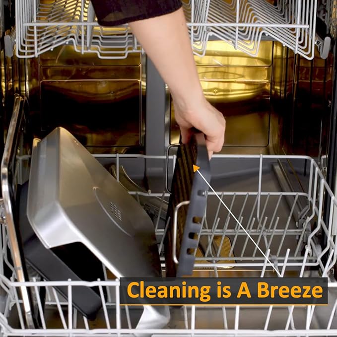 - [Use & Cleaning & Store is A BREEZE!]-Ultra-clear LED smart display helps yor adjusting the temperature from 200℉ to 450℉. The non-stick coating heating plate allows the food to be taken out easily without residue. Multiple detachable parts make the machine have no unreachable clean corners. Dishwasher safe parts: Glass Lid, Perforated heating plates, Silver heat reflector.
