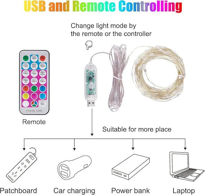 - USB Powered String Lights: USB plug is suitable for power bank, car charging, adapters, notebook computers, USB hubs, etc. Easy to use and carry, you can light up these LED fairy lights colorful anywhere. Please note that the USB adapters are not included