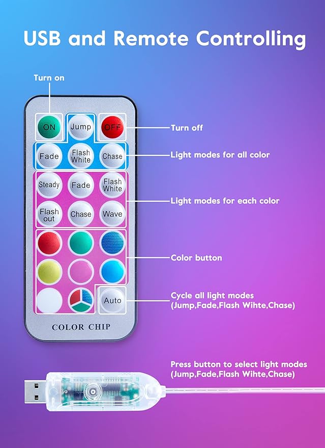 - Multicolor Fairy Lights with Remote: The remote effective range can reach 16 ft. You can use the remote to point at the receiver in the USB plug, turn the fairy lights for bedroom on and off, choose the color or modes of the light. 4 modes on top of remote will light up for all colors, If you want to light up the single color, you can choose one of 6 modes on the middle of remote, then choose the color you like. And auto mode will cycle all the modes
