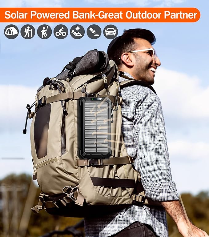 - [Sturdy&Durable Design for Outdoor] This solar battery pack is well made to be Waterproof/Shockproof/Dust-proof, which can withstand the harsh environment outdoors. It’s equipped with Dual super bright LED lights, a Must-Have tool for outdoor activities and home emergencies.