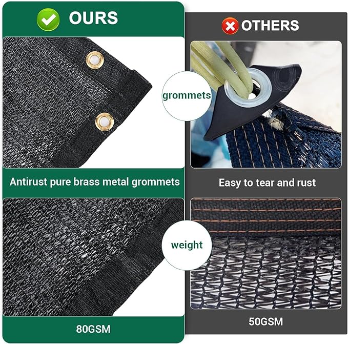 - Longer Service Life:This anti-aging shade cloth equipped with solid copper metal grommets on the edge to solve the problem of aluminum lock deformation.Four corners of the fabric are crossing sewed and reinforced, which enhance the endurance of pulling.