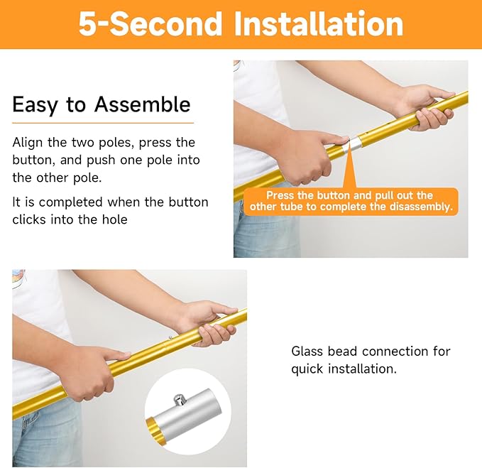 - Simple Button Lock Mechanism Simplifies Your Installation Process: Just push the 2 sections of poles into the holes by buttressing,after use,simply pull the spring to disassemble.