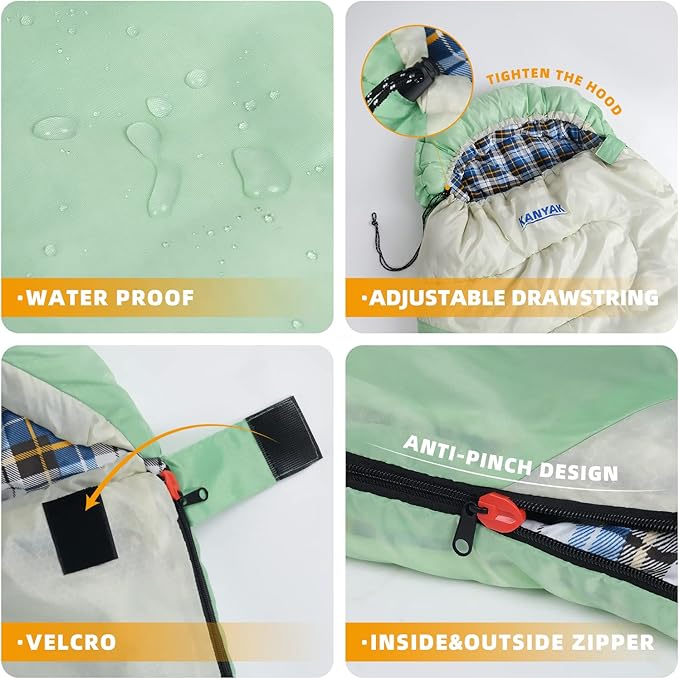 - 【Sleeping Bag Material】Shell Material - 210T Anti-tearing Polyester Fabric which is waterproof and Breathable for optimal warmth and insulation to protect you from the elements. Lining Material - polyester pongee which is cosy and flexible to make you sleep well with KANYAK sleeping bag.