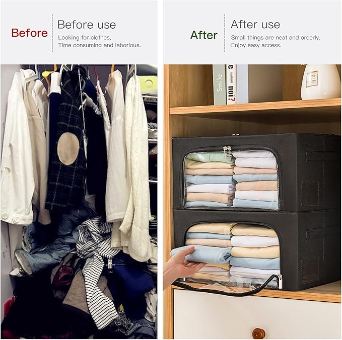 3Pack Frame Storage Box - Clothes Storage Bin Bags Oxford Fabric Foldable Stackable Container Organizer Set with Clear Window & Carry Handles (Black, Small-22L)