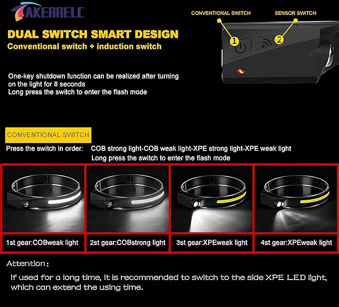 - ⭐️【Upgrade】In order to improve the lighting brightness while increasing the battery life, we used the new smart chip and upgraded the battery. The smart chip will reduce the brightness of the headlamp to a certain extent after 5 minutes of turn on (still bright).Please note:This headlamp has a maximum brightness of 1200 lumens in SOS strobe mode and 350 lumens for regular lighting.When it is turned on, please do not face it directly with your eyes or someone else's eyes.