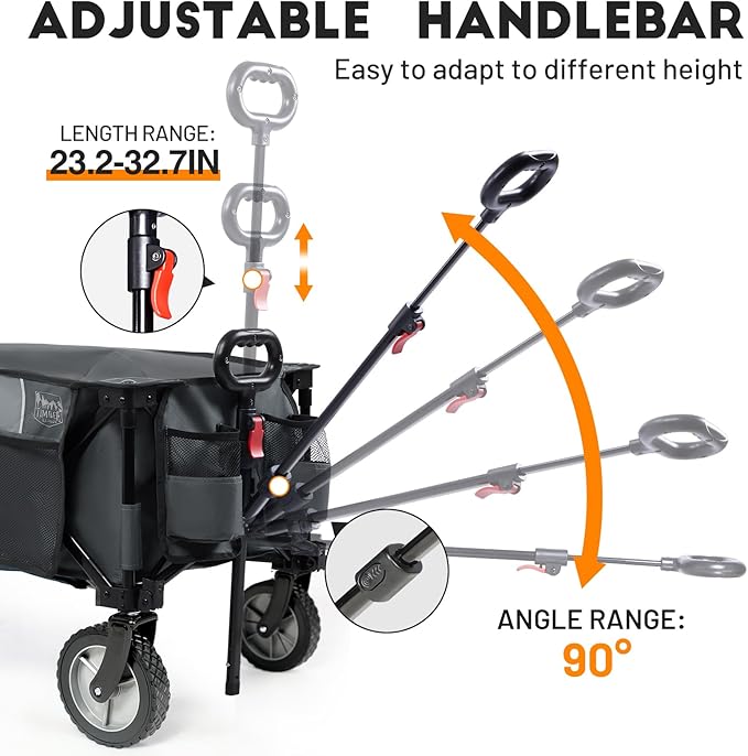 - 360° Rotating Wheels and Adjustable Handle: 360° rotating front wheels enable this wagon cart to move smoothly in any occasions, like camping, shopping and gardening; adjustable handle design can fit the need for different people.