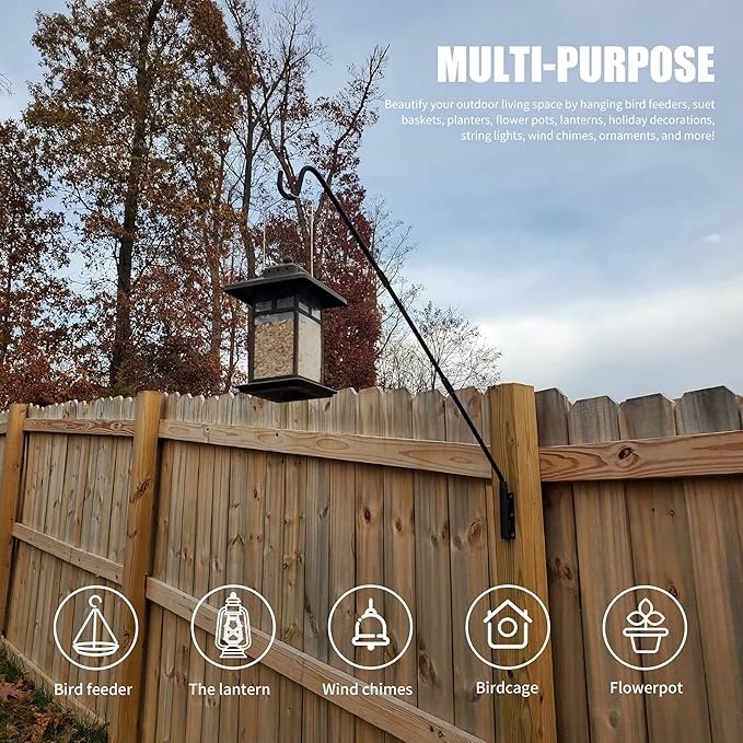 - Widely Outdoor Use - Our shepherd hook for outdoor is sturdy and easy to handle. Designed for hanging a variety of bird feeders, suet baskets, lanterns, holiday decorations, string lights, planters, flower pots, wind chimes, ornament to decorative your outdoor living space.