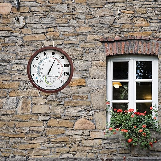 Indoor Outdoor Thermometer Large Numbers 12 Inch Wall Weather Thermometer Hanging Garden Decor Hygrometer No Battery Needed (Brown)