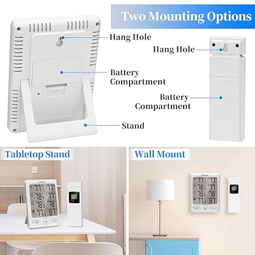 - 【Accurate Temperature & Humidity Readings】 Remote thermometer wireless outdoor indoor with large LCD display measures the real-time temperature and humidity with past 24 hours Max/Min records and trends arrows. Assess historical data and refer to the Comfort Indicator to quickly know your home living conditions. Works with the hi/lo temperature and humidity alert function, helps create a healthier lifestyle.