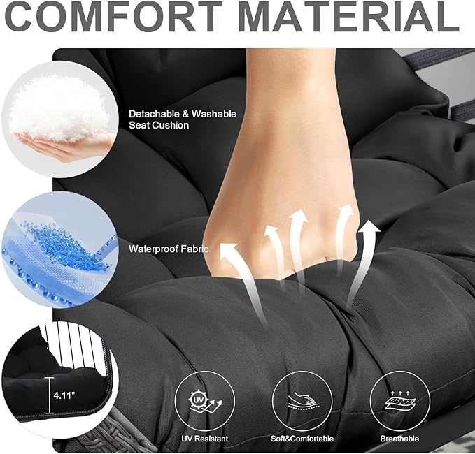 PRIVATE GARDEN Indoor Outdoor Patio Hanging Egg Chair Wicker Swing Hammock Chairs UV Resistant Cushion Folding Aluminum Frame 330lbs Capacity for Patio Bedroom Balcony (Black)