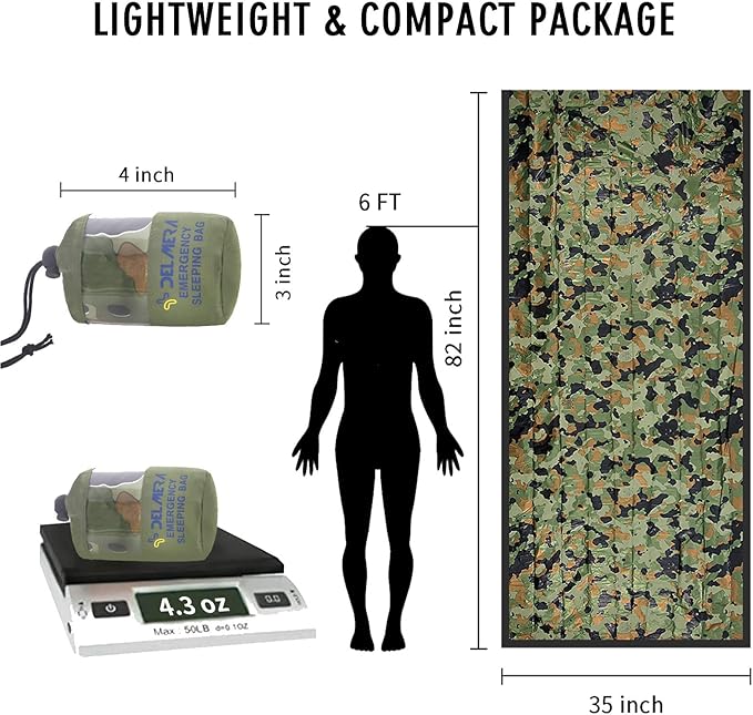 - INCREDIBLY PACKABLE AND PROTECTION AGAINST RAIN, WIND—Light and massively compact emergency bivy with handy nylon stuff drawstring bag sack, so you can carry this sleeping bag with your survival kit everywhere you go without weighing yourself down. Heavy-duty aluminized PE interior material can resist rain, wind, snow and other external impact. We recommend keeping it with your survival kit, in your bug out bag, camping gear, and glove box so you have it ready when you need it