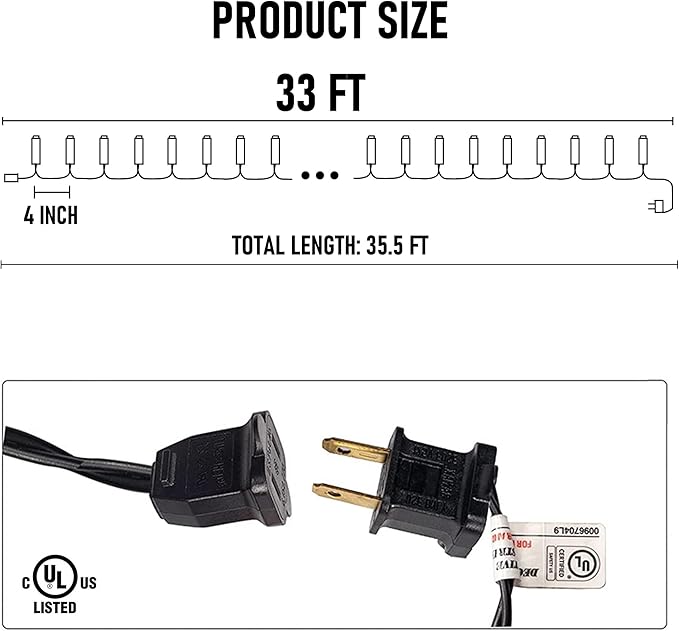 - Light Specifications: With 100 purple & orange LED lights, each Halloween string lights is 35.5 ft long in total, wire with LED bulbs is 33 ft, lead cord without lights is 2.5 ft, spacing between per LED bulb is 3.9 inch. Waterproof design allows it to be used indoors and outdoors.