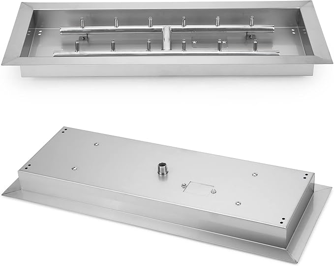 - Specification - Inside: 24 x 8 inch; Outside: 26.5 x 10.5 inch; Depth: 2 inch; Gas inlet size: Male 1/2 inch; Includes a extra mounting plate for optional igniter (igniter not included); Uses approximately 25 pounds of Fire glass.