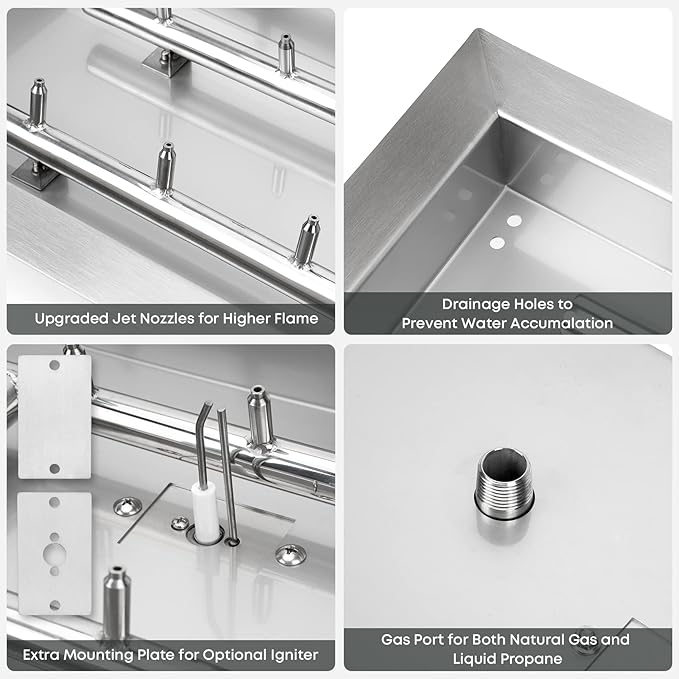 - Easy Installation: All you have to do is to drop this burner pan into your fire pit, hook up to a gas source, add some fire glass and you’re done (gas hoses and connection kit are not included).