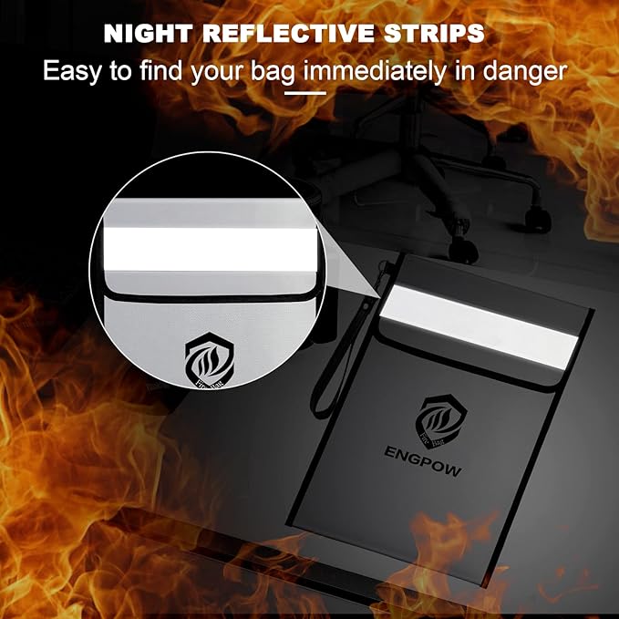 - Lock and reflective strip design: Are you still worried that you don't have a safe enough place to store your valuables? Fireproof bag has a high quality combination lock design for added storage security.The reflective strip design on the flap of the bag allows you to immediately find your fireproof bag even at night, protecting irreplaceable documents and valuables from fire.Nothing is completely foolproof, but added protection is always a good idea.
