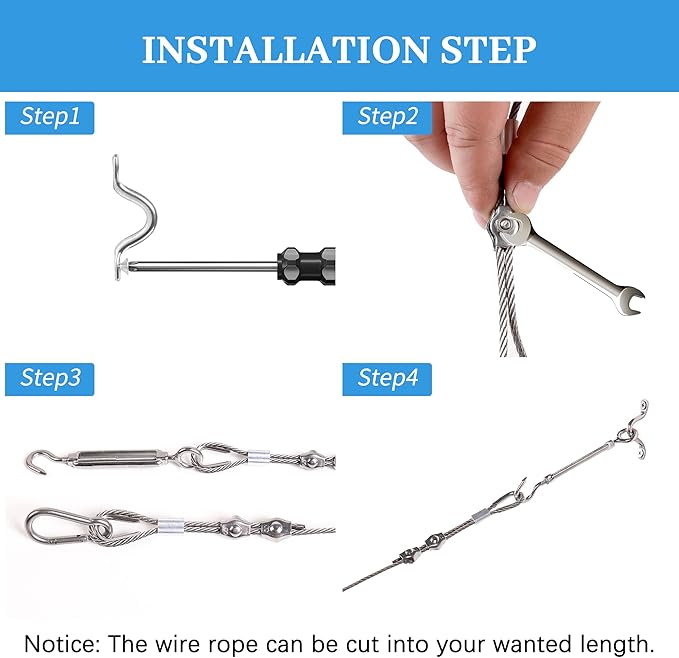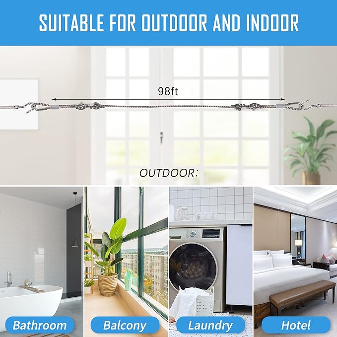 - Wide Application: Can use it as a clothesline, party string lights hanging kit, also Hanging photos, clothes, or any hanging needed, perfect for outdoor gardens, garages, greenhouses, and shade sails