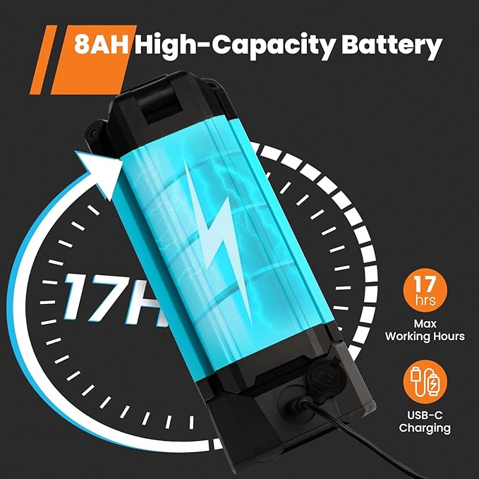 - Cordless Design & 8 AH High Capacity Battery - Amazingly 8 AH Battery supports longer working hours per charge. The max working hours under low-brightness mode is approximately 17hrs, which is sufficient for multiple outdoor activities. USB-C port functioning convenient charging with TYPE-C cable. The cordless design of this work light gives you more portability While working. Giving you more freedom of use, no mater indoor or outdoor