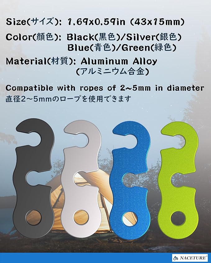 - โ HIGH-QUALITY AND DURABLE ROPE TENSIONER - Replaces the cheap plastic cord tensor you already have on your camping and outdoor equipment, and say hello to these amazing, compact, and durable guy lines tensioner tent cords made of quality aluminum alloy which is ultralight, and convenient to carry in your backpack on a camping.
