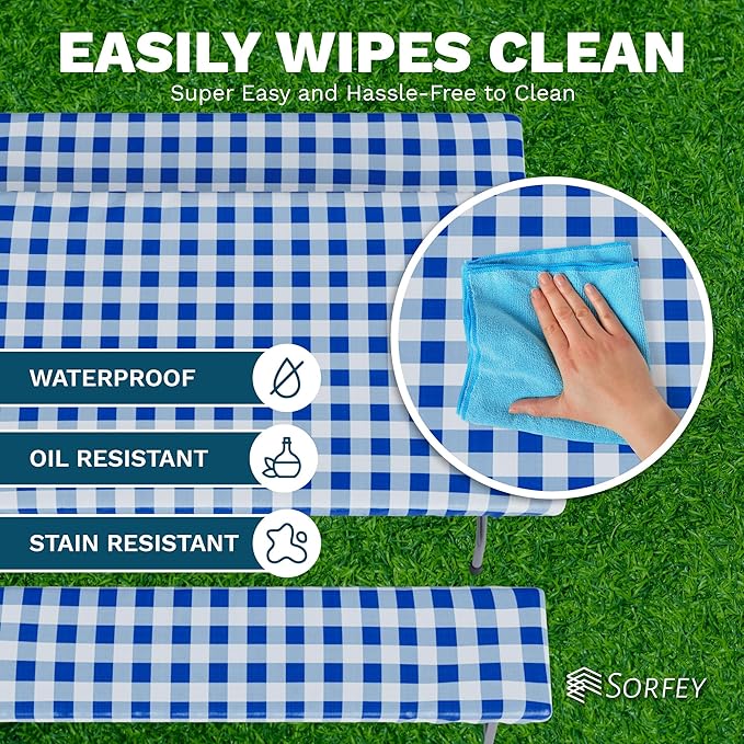 - FITTED TABLECLOTH FOR SECURE FIT- The Sorfey Picnic Table Tablecloths were designed to stay on the table even under windy weather, so that nothing keeps you back from enjoying your outdoors dining. Set includes: 1 tablecloth and 2 bench covers.