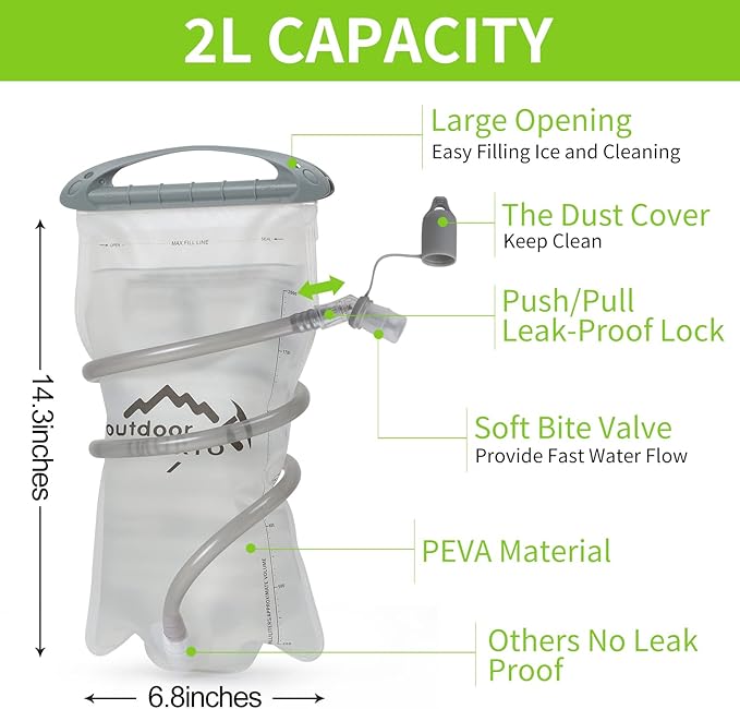 - đ´âăPremium Quality Water BladderăThe Hydration Pack Backpack comes with a 2 liter hydration water bladder and two 250ml soft flask. A switch valve and a cover cap make double leak-proof. Large opening allows quick filling of water and ice and it is easy to clean, the water line (40"length,0.4"diameter) provides a wholesome flow for easy drinking keeps your water tasting fresh, all day. The water temperature is range -20~+50â.