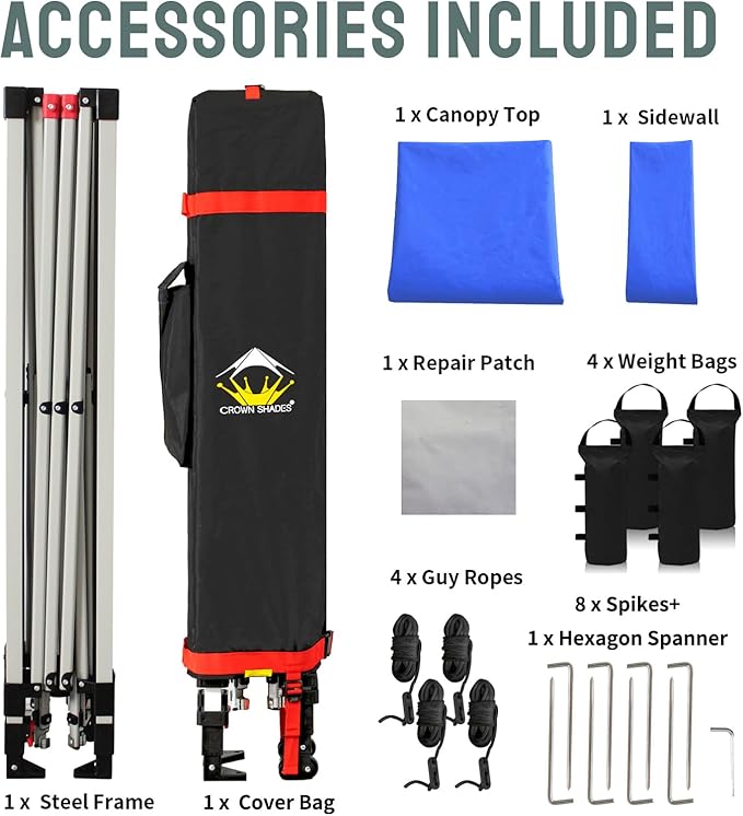 CROWN SHADES 10x10 Pop Up Canopy with 1 Side Wall - Beach Tent with One Push Setup - Outdoor Sun Shade for Events, Parties, Camping - Gazebo with STO-N-Go Cover Bag (Blue)