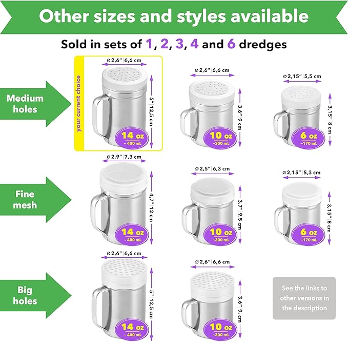 - You will receive two big stainless steel cooking dredges (14 oz) with handles, metal twist-off lids, and plastic caps; style: medium